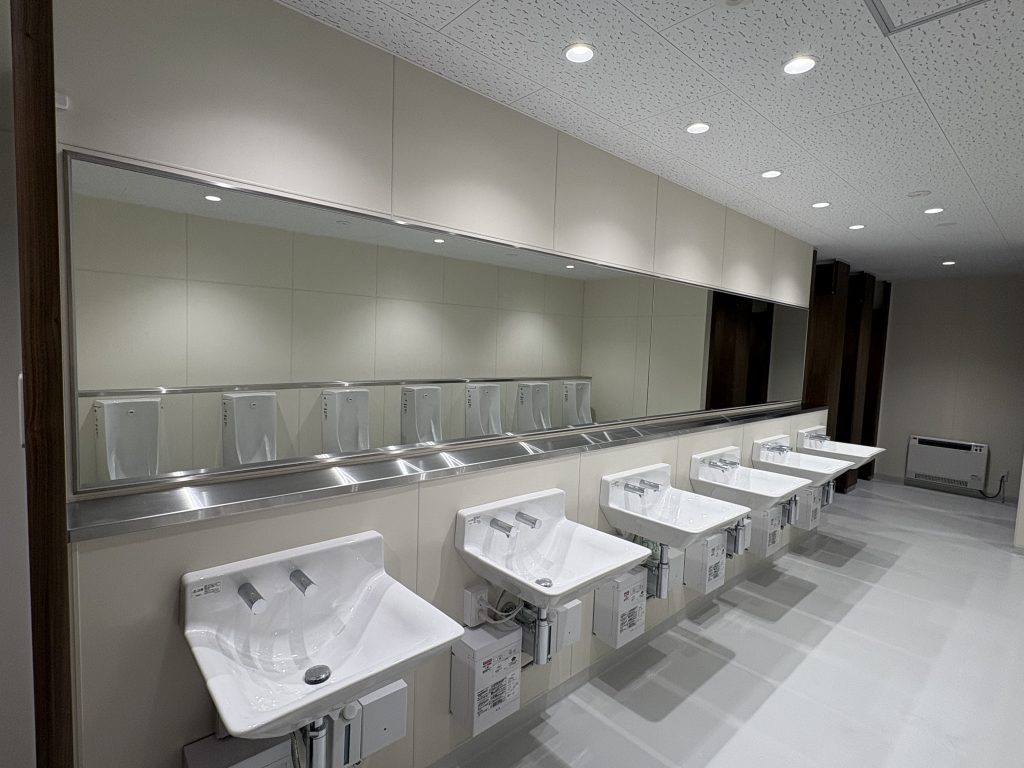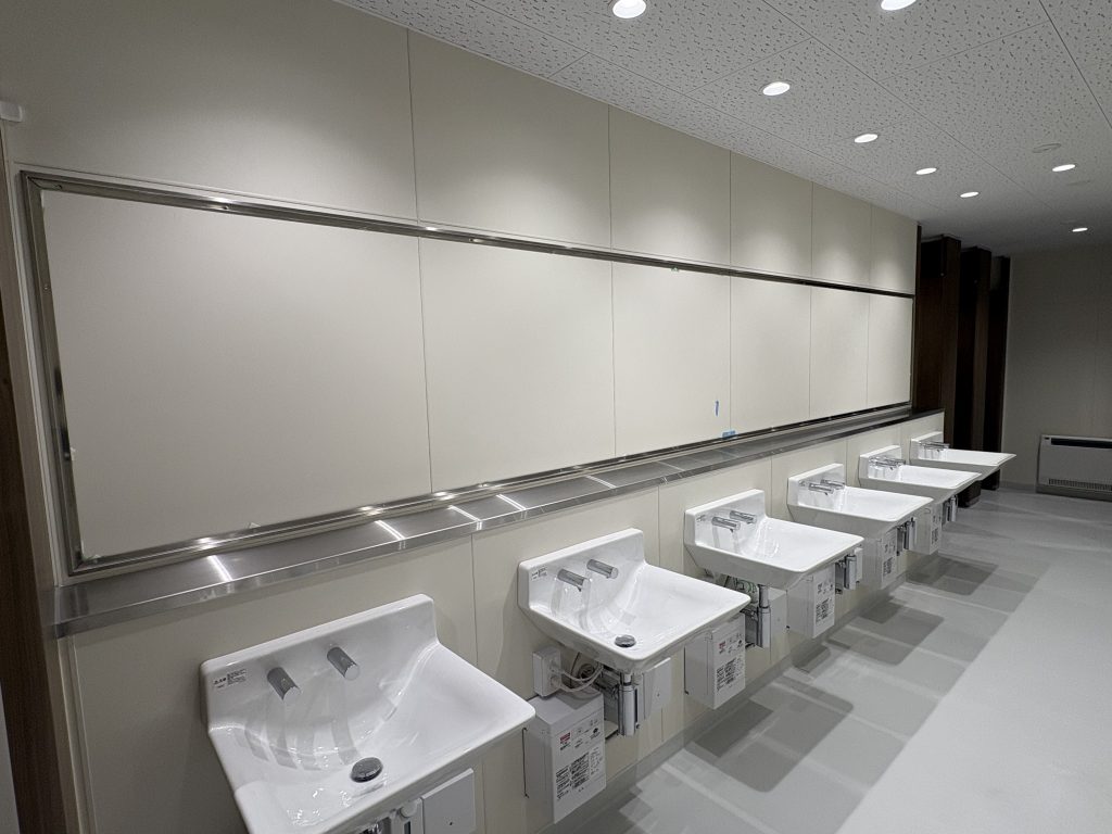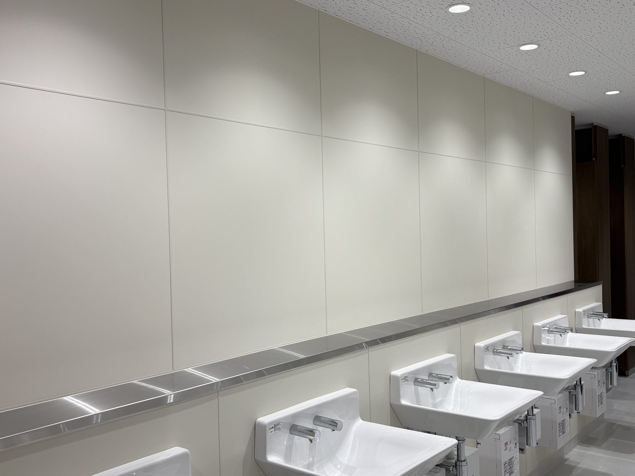 某施設の鏡工事です。枠取付から鏡貼り付けまで当社のみで作業可能です。破損が心配な施設にはステンレスの鏡面材を鏡代わりに設置できます。